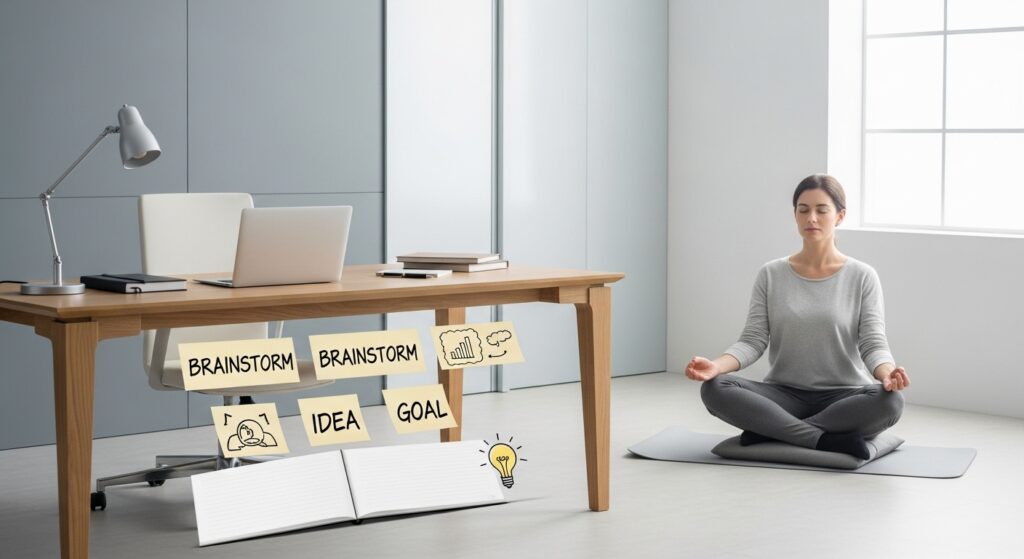 Em vez de tentar “forçar” ideias, o brainstorming consciente propõe um estado mental calmo e observador — permitindo que o cérebro associe informações livremente, sem julgamento ou pressa.